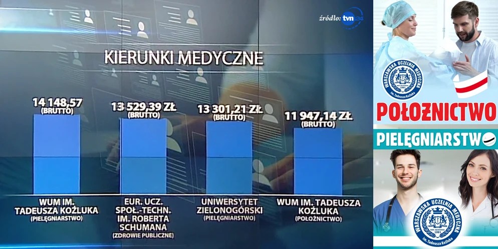Jak wynika z danych Personnal Service na najlepszą pensję w sektorze zdrowia mogą liczyć absolwenci Pielęgniarstwa oraz Położnictwa Warszawskiej Uczelni Medycznej im. Tadeusza Koźluka. W podanym przez TVN24 Biznes za ekspertami Personnal Service, zestawieniu – WUMed widnieje dwukrotnie jako uczelnia zapewniająca najwyższe kwalifikacje zawodowe, mające odzwierciedlenie również w godnym wynagrodzeniu.